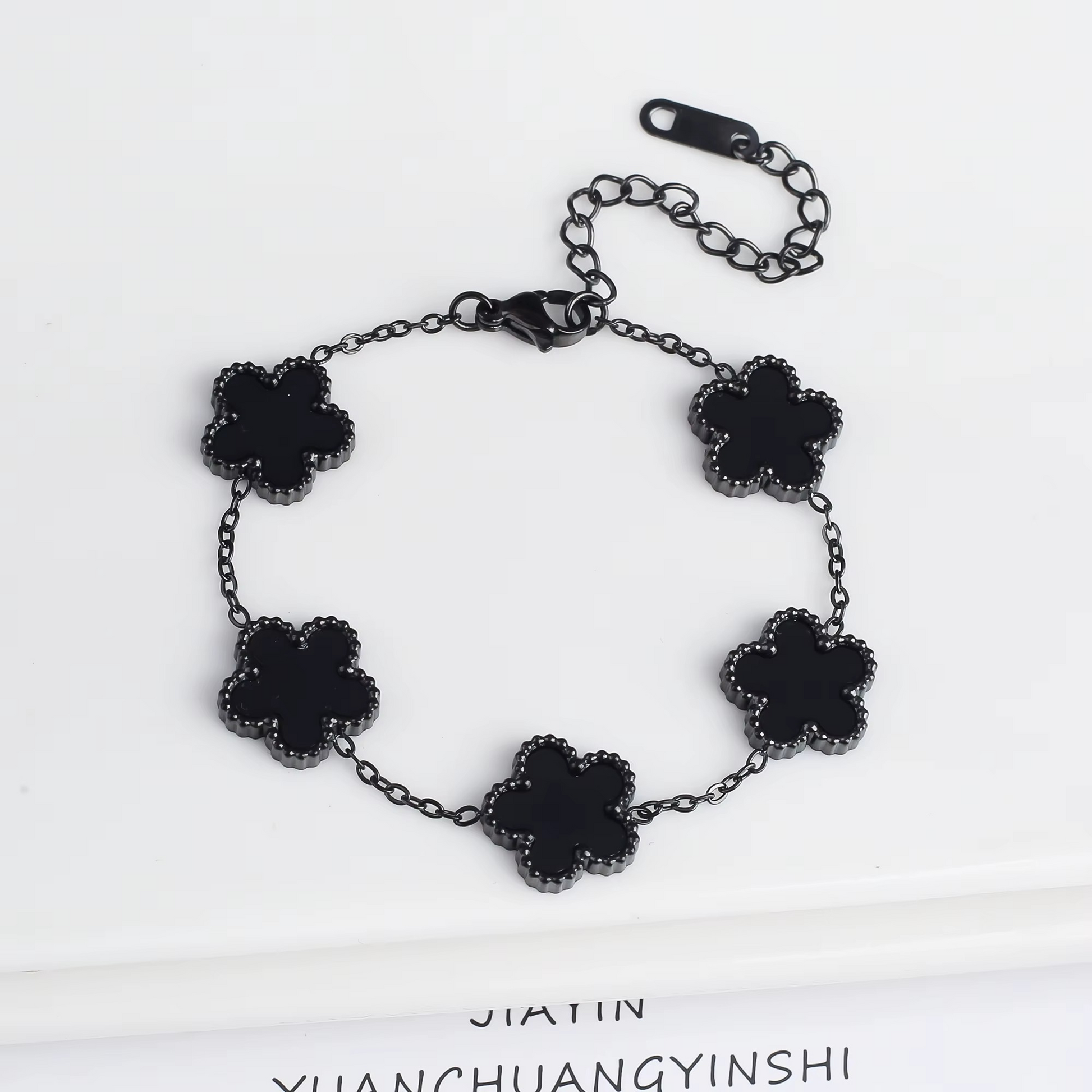 Elevate your style with this classic luxury stainless steel bracelet featuring five delicate flower charms. Designed for women, its adjustable fit ensures comfort for any wrist size. Perfect for parties or as a thoughtful gift, this bracelet combines timeless elegance with durable craftsmanship, making it a versatile addition to any jewelry collection. The subtle clover design adds a touch of charm and good fortune to your look.